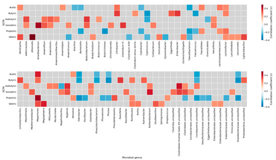 Correlation heatmap between short-chain fatty acids and gut microbial genera. Spearman correlation coefficients between SCFAs (acetic, butyric, isobutyric, isovaleric, propionic, and valeric acids) and the relative abundance of microbial genera. Positive correlations are shown in red and negative correlations in blue; gray cells indicate non-significant associations (p ≥ 0.05). The heatmap was generated using the complete sample set (all participants combined), without stratification by study groups. SCFAs, short-chain fatty acids.