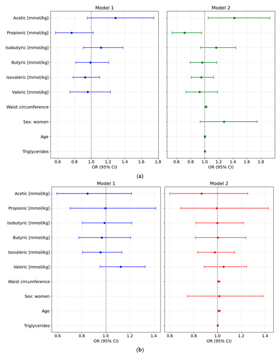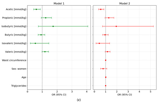 Using normoglycemia as the reference category, the full-adjusted logistic regression analysis based on normalized SCFA values showed that higher levels of acetic acid were positively associated with preDM (Model 2: OR = 1.4219 [95% CI: 1.049–1.9273], p = 0.028), while propionic acid levels were inversely associated with this condition (OR = 0.714 [95% CI: 0.5338–0.9551], p = 0.028). No significant associations were observed for other SCFAs. Waist circumference was also independently associated with higher odds of preDM (OR = 1.0164 [95% CI: 1.0029–1.0301], p = 0.0215), whereas sex, age, and triglyceride levels were not significant predictors (Figure 3a).