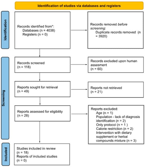 The systematic search through all databases initially identified 4038 manuscripts of interest; however, when duplicates were removed, 49 articles were left for assessment of eligibility, from which 18 studies were selected for this review. The flowchart of this systematic review was obtained with the online tool PRISMA 2020 [], and it is presented in Figure 1.