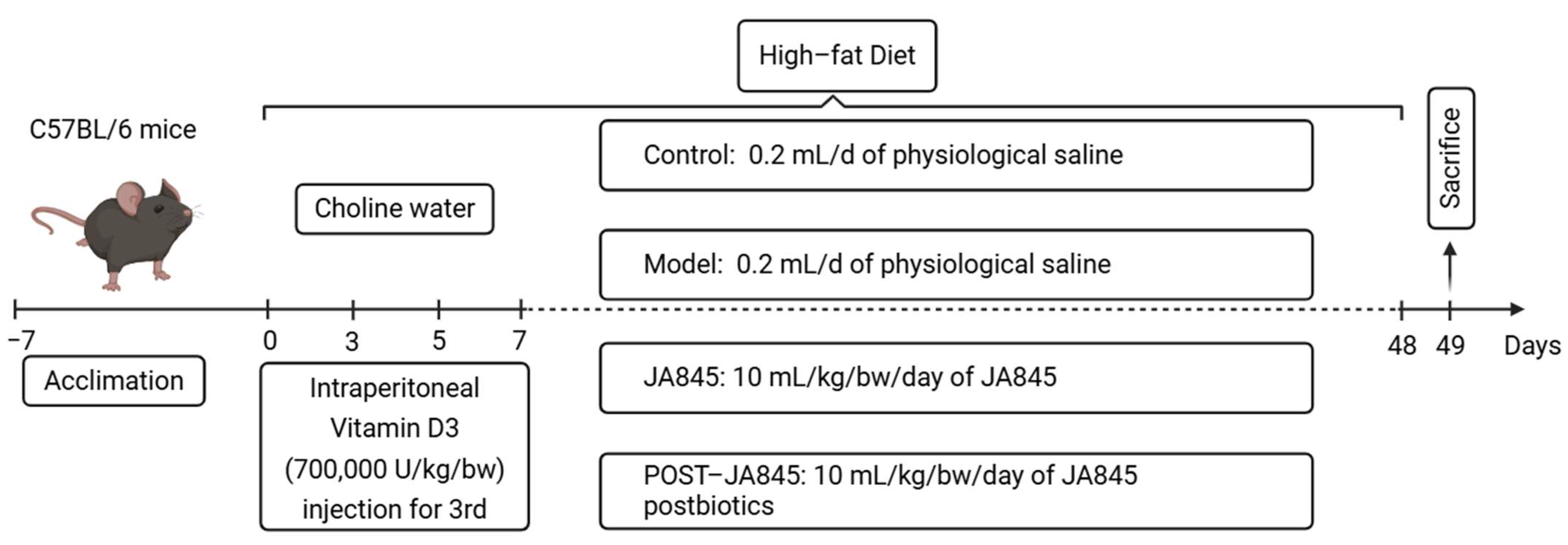 - Ma, L.; Zhao, Z.; Zhao, Y.; Gao, Y.; Zhao, L.; Li, S. Weizmannia coagulans JA845 improves atherosclerosis induced by vitamin D3 and high-fat diet in rats through modulating lipid metabolism, oxidative stress, and endothelial vascular injury. J. Appl. Microbiol. 2023, 134, lxad165. [Google Scholar] [CrossRef]