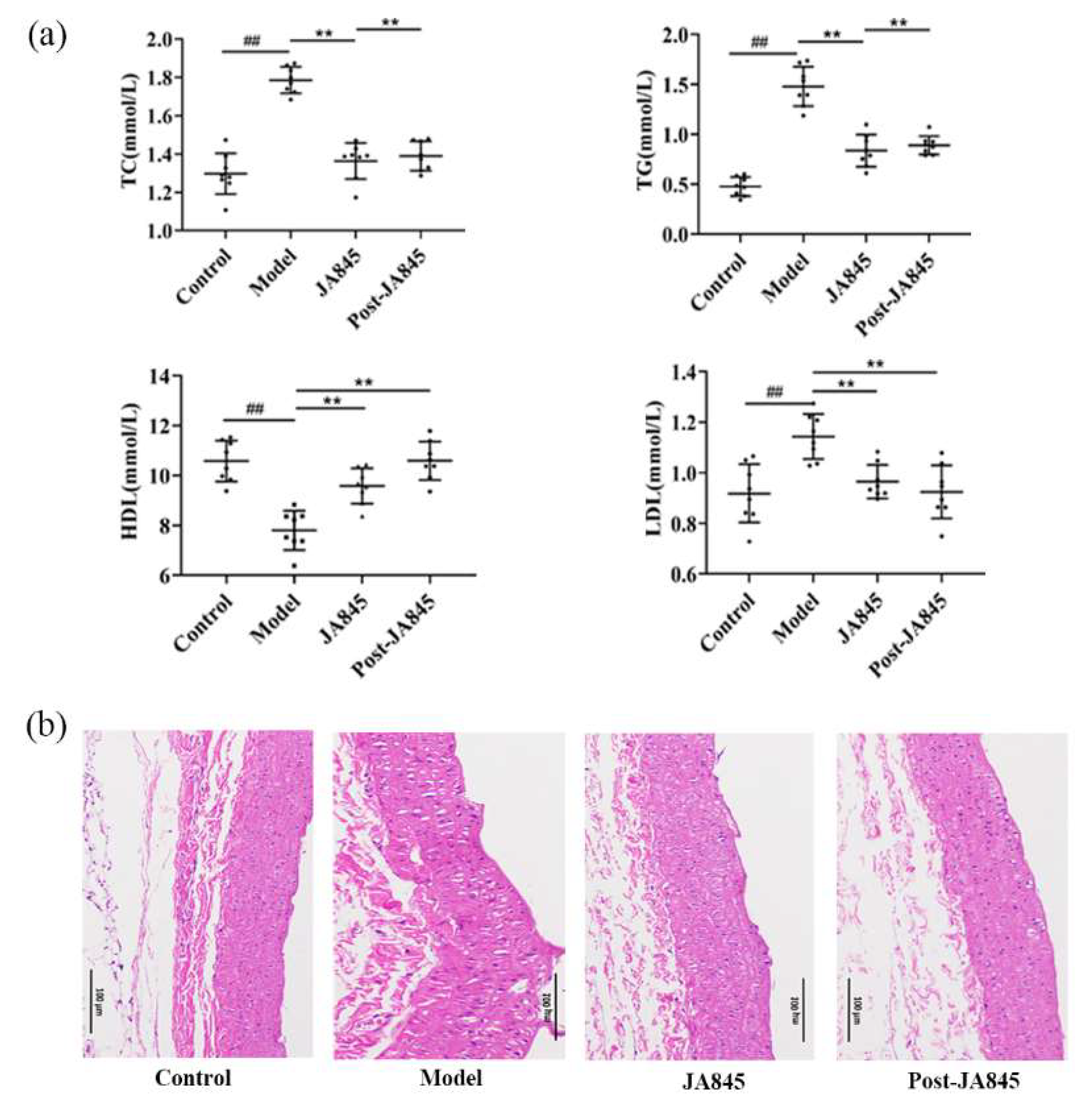 3.1. W. coagulans JA845 Postbiotics Regulates the Serum Lipid Levels in AS Mice