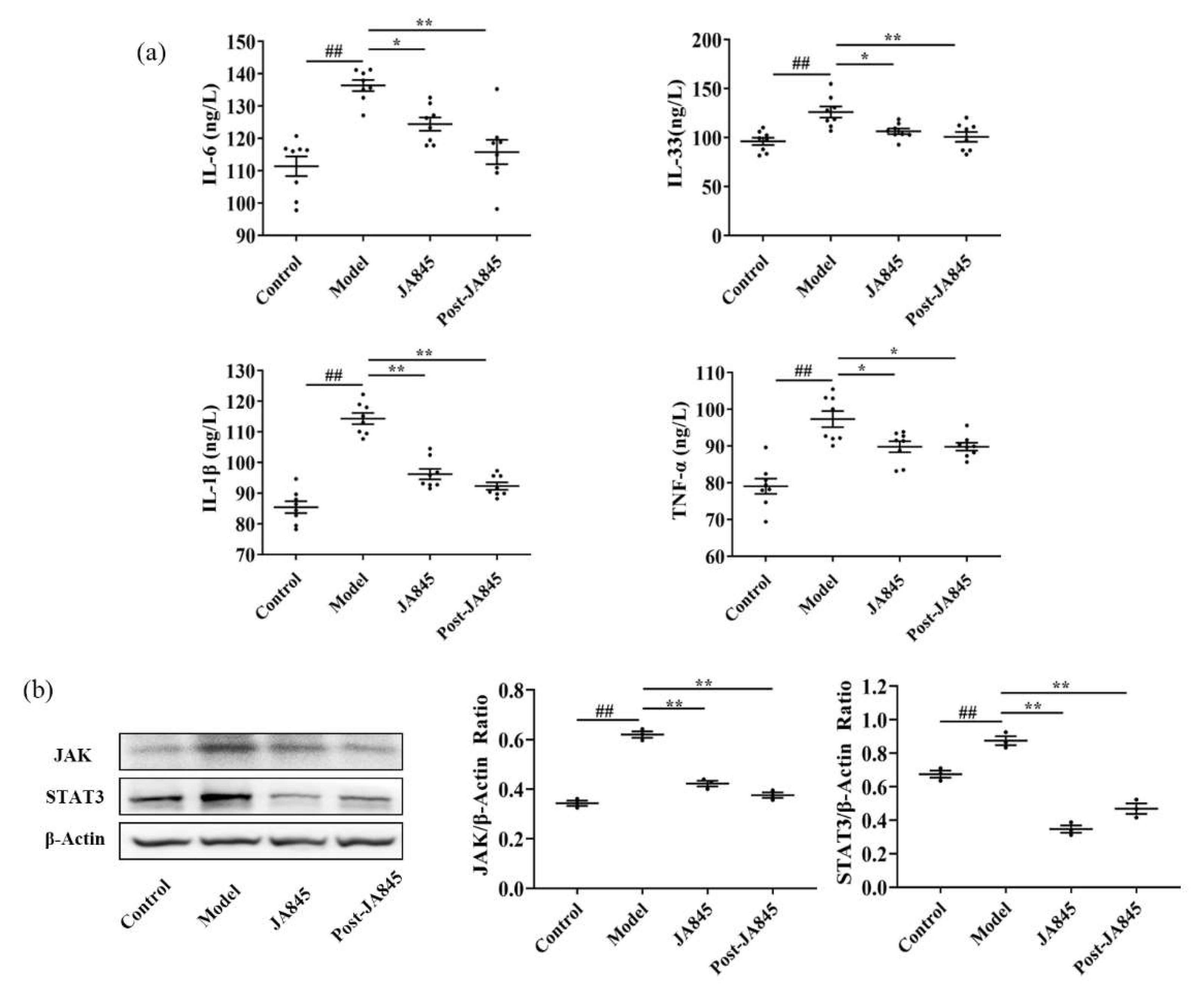 3.6. W. coagulans JA845 Suppresses the Activation of the JAK/STAT3 Pathway in AS Mice
