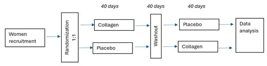 Firstly, participants assigned to Group 1 received 5 mL of fish gel collagen (from silver carp; Lorenz & Woźniak General Partnership, Poland) supplementation with 200 mL of pure water for 40 days administered directly into the oral cavity, whereas participants in Group 2 (the control group) received only 200 mL of pure water for 40 days. The volunteers took the supplement with water once a day in the morning. A 40-day washout period was then implemented in both groups. After the washout, participants crossed over: those who had received collagen plus water switched to water only (control), and those who had received water only switched to collagen plus water. All individuals included in this study had internal self-control (Figure 1). Monitoring the collagen supplement intake was carried out regularly directly by telephone. Additionally, the assessment of the women’s diet was carried out with the use of a 3-day nutritional interview, which included 2 working days and 1 weekend day (Dietetyk, Poznan, Poland).