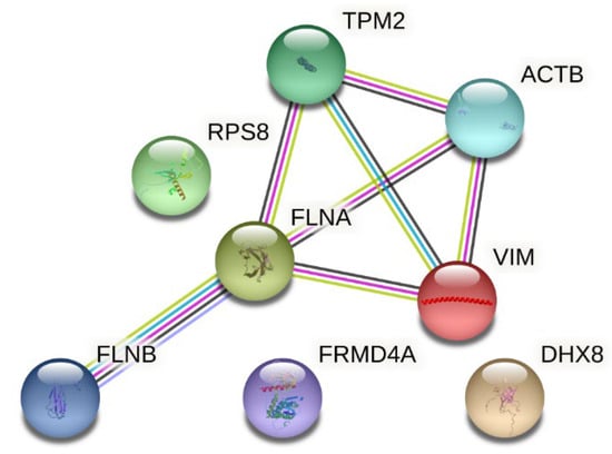 Interactions between proteins differentiating the study group before and after collagen supplementation (source: https://string-db.org (accessed on 5 March 2025)). Legend: TPM2—Tropomyosin beta chain; ACTB—actin, cytoplasmic 1; RPS8—40S ribosomal protein S8; FLNA—Filamin-A; VIM—Vimentin; FLNB—Filamin-B; FRMD4A—FERM domain-containing protein 4A; DHX8—ATP-dependent RNA helicase DHX8. The nodes represent query proteins and the first shell of interactors; inside the nodes, a known or predicted 3D structure is presented. Interactions (represented by lines): known interactions: blue—from curated databases; pink—experimentally determined; predicted interactions: green—gene neighborhood; red—gene fusion; navy—gene co-occurrence; and others: light green—text mining; black—co-expression; and light violet—protein homology.
