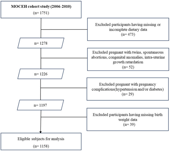 The study was conducted between August 2006 and December 2010, recruiting 1751 pregnant women at 12–18 weeks of gestation from three university hospitals. Of these, 473 women were excluded owing to missing or incomplete dietary intake data. Additionally, 52 participants with twins, spontaneous abortions, congenital anomalies, or intrauterine growth retardation, as well as 29 individuals with pregnancy complications (hypertension and/or diabetes), were also excluded. Thereafter, 39 participants with missing birth weights were excluded from the remaining 1197 individuals, resulting in a final cohort of 1158 participants (Figure 1).