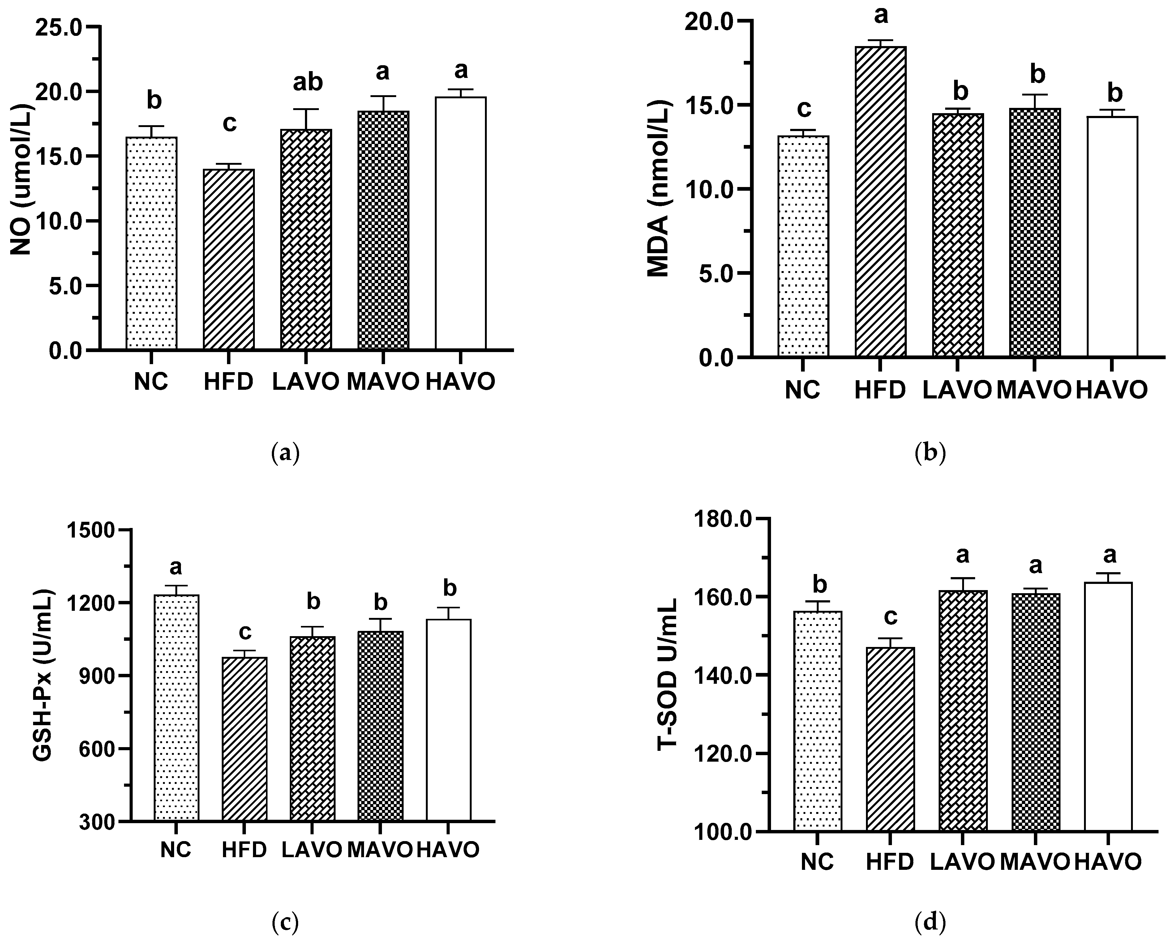 3.5.3. Effect of AVO on Oxidative Stress Factors in Mice Serum
