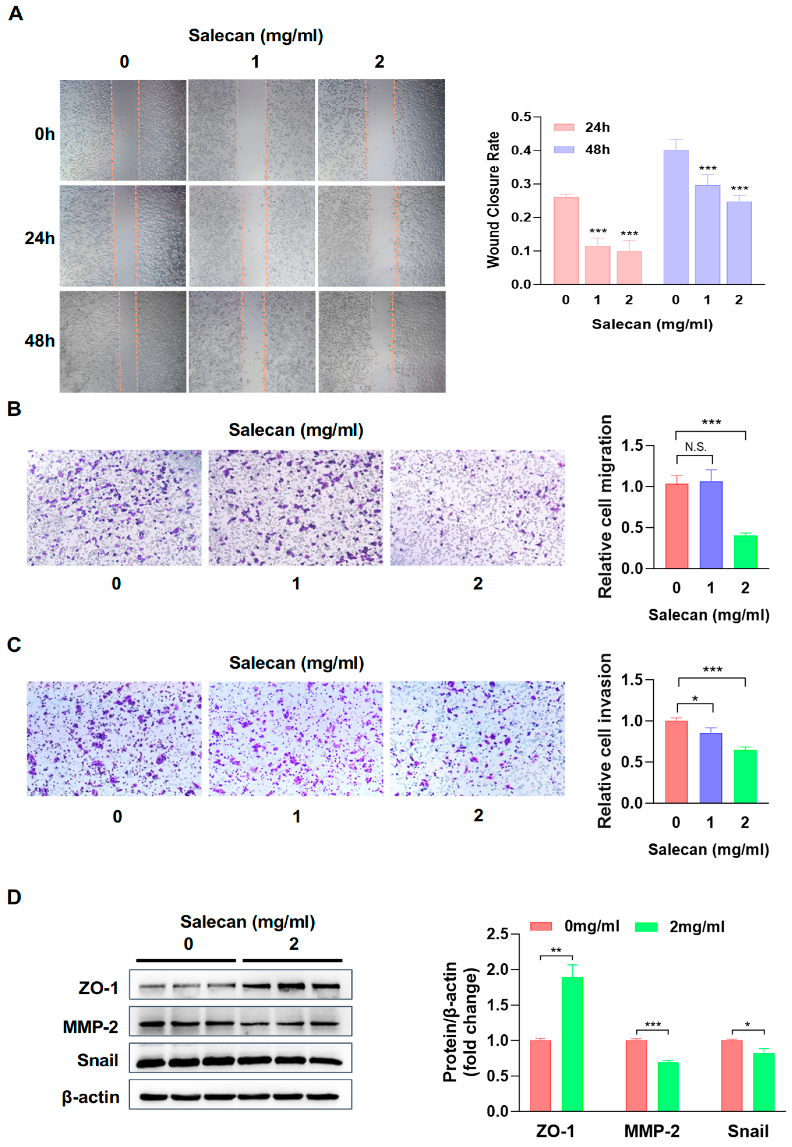 3.2. Salecan Attenuates Pancreatic Cancer Cell Migration and Invasion in a Concentration-Dependent Manner