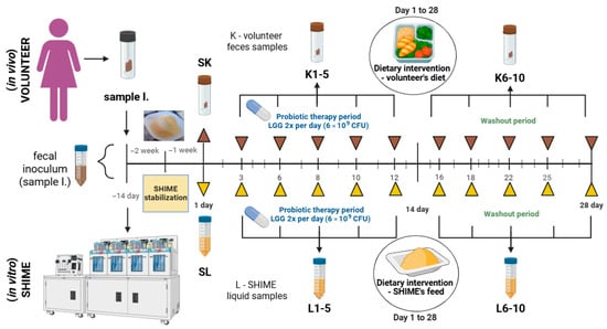 Both the SHIME model and the volunteer were subjected to parallel interventions: a 28-day dietary modification and supplementation with a commercial formulation containing LGG (ATCC 53103) administered during the first 14 days of dietary intervention.