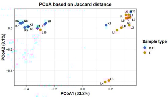 Principal coordinate analysis of the composition of microbiota in SHIME (L) and stool (K), including inoculum (I) samples.