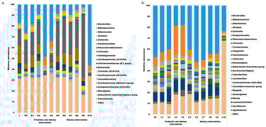 Although an increase in the relative abundance of the former group of Lactobacillus (as classed under the older nomenclature and identified using the SILVA database for OTU assignment) was expected during the probiotic intervention as well as a decrease after its cessation, only in SHIME was such a phenomenon observed. The relative abundance of Lactobacillus was at 0.5% before the supplementation period (sample SL) and ranged from 2.23 to 2.63% while it lasted (samples L1, 2, and 5) and ranged from 1.21 to 1.89% after its cessation (samples L6, 7, 8, and 9). Lactobacillus was detected in all SHIME samples. On the other hand, in feces, this genus was only present in the sample used for the inoculum preparation at a relative abundance of 2.2%. After that, it was not detected in any of the samples collected during or after the probiotic intervention.