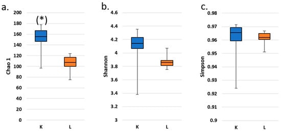 Box plots of fecal (K) and SHIME (L) microbial α-diversity: Chao1 (a), Shannon (b) and Simpson (c) indices along the experimental trial. Reported data exclude outliers and the inoculum. (*) denotes a statistically significant difference between α-diversity in K and L according to a Wilcoxon’s signed-rank test (p < 0.05). No significant differences between pairs of data were detected after Bonferroni correction.