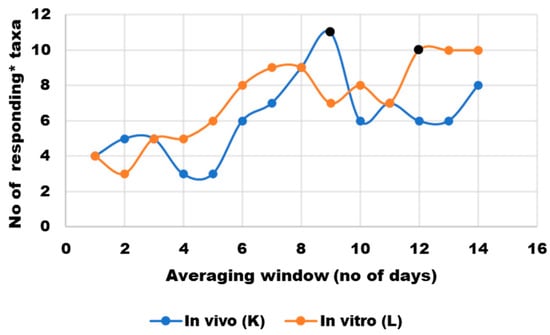 Sensitivity analysis of nutrient content averaging window to correct for a lag in microbial response to nutritional changes; * responding taxa were defined as those whose abundance correlated positively (Spearman’s ρ > 0.7) with at least one macronutrient or group of macronutrients (protein, animal protein, non-animal protein, arabinogalactan, arabinoxylan, arabinogalactan + arabinoxylan, pectin, soluble fiber, starch, sugars, protein-to-soluble-ratio). Black markers indicate averaging windows that were selected for further statistical analyses.