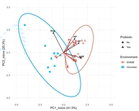 To quantitatively assess whether the probiotic and dietary intervention had different outcomes in two microbiota culturing environments, a linear model was fitted to bacterial abundance and intervention data (Section 2.5). The analysis focused on eight genera prevalent in the majority of SHIME and fecal samples (Section 3.1) and four selected macronutrients (soluble fiber, sugars, non-animal protein, and animal protein). A parallel analysis, at a phylum level, confirmed that the significance of the effects translated to the whole studied microbial population (open data [22]). The type III ANOVA analysis did not detect significant main effects for the intervention variables across the pooled dataset for eight selected genera (SHIME and volunteer considered together). In contrast, a strong main effect of the Environment on PC1_micro (explaining ~62% variance) was noted. Furthermore, a significant interaction between the Environment and PC1_diet and Environment and Probiotic on PC1_micro (~7% and 4% variance explained, respectively) was identified. Out of these results, at the phylum level, only the interaction effect between the Environment and Probiotic was not significant, whereas a significant main effect of PC1_diet and its interaction with the Environment on PC2_micro was found.