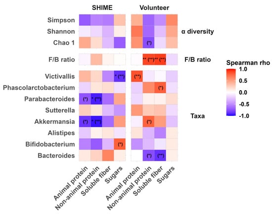 The biplot included overlaid vectors from a PCA on macronutrient concentrations. The abundance of most genera selected for analysis showed a positive correlation with at least one macronutrient, either animal protein, non-animal protein, or soluble fiber. Since the microbiota composition was significantly affected by the interaction between the Environment and PC1_diet, a separate analysis investigating responses to macronutrients in each environment was performed. For this purpose, a series of Spearman’s correlation analyses was conducted (Figure 7). Besides the eight genera highly prevalent in SHIME and fecal samples, broader descriptors of the microbiota’s condition, such as α-diversity indices and the F/B ratio, were also included.