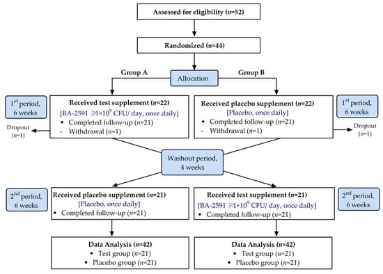 Participants were randomly assigned to two groups using a color-coded ball-draw method. Group A received the probiotic for six weeks, followed by a four-week washout period, and then a six-week placebo phase. Group B followed the inverse sequence, receiving the placebo first, followed by the washout, and then the probiotic. Baseline demographic and clinical data were collected before the intervention. Blood drawings were conducted in Day 0, Week 6, Week 10, and Week 16. Participants were instructed to fast for 10–12 h before each blood draw. Each sample consisted of 10 mL of venous blood collected in serum separator tubes and transported at controlled temperatures. Participants consumed encapsulated BA-2591 supplements daily before breakfast, and adherence was monitored through weekly phone interviews. Adverse events were systematically documented and evaluated throughout the study. All blood chemical tests, including CBC, liver and renal function tests, lipid profiles, hs-CRP, and HbA1c, were performed at the Prompt Service Center at the Faculty of Associated Medical Sciences, Chiang Mai University.