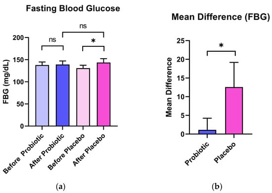 Clinical effects of a 6-week consumption of the test product on changes in fasting blood glucose levels (FBG) in volunteers (n = 42). (a) illustrates the comparison of mean values of indicators before and after consuming the test product containing the probiotic (BA-2591) and before and after consuming the placebo. (b) demonstrates the mean differences between volunteers in the probiotic group and those in the placebo group. ns Indicates no statistically significant difference in mean values between the two groups at p < 0.05. * Indicates a statistically significant difference in mean values between the two groups at p < 0.05.