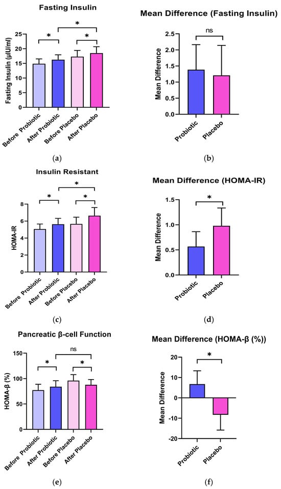 The impact of a 6-week test product consumption on pancreatic function in volunteers (n = 42); (a,b): Fasting insulin levels, (c,d): Insulin resistance via HOMA-IR, (e,f): Beta-cell function via HOMA-B. The findings are delineated as mean values for indicators are compared to pre- and post-consumption of the probiotic and placebo; (a,c,e); and mean differences between the probiotic and placebo groups are compared; (b,d,f). ns indicates no statistically significant difference in mean values between the two groups at p < 0.05. * indicates a statistically significant difference in mean values between the two groups at p < 0.05.