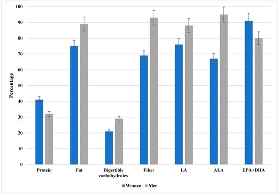 The percentage of patients with inadequate intake of protein, available carbohydrates, fat, dietary fiber, LA, ALA, and EPA + DHA. LA, linoleic acid; ALA, alpha-linoleic acid; EPA, eicosapentaenoic acid; DHA, docosahexaenoic acid. Data are presented as percentages with 95% confidence intervals (error bars) stratified by sex (women in blue, men in gray). As illustrated, a considerable proportion of patients demonstrated inadequate intake across multiple nutrients, with the most pronounced inadequacies observed for EPA + DHA. The exact percentages with corresponding confidence intervals for both women and men are provided in Supplementary Table S2.