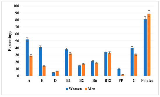 The percentage of men and women with inadequate vitamin intake relative to dietary reference values (EAR or AI). Data are presented as percentages with 95% confidence intervals (error bars) stratified by sex (women in blue, men in orange). Notably, folate intake inadequacy was the most pronounced, affecting the majority of both women and men. Additional details, including exact percentages with 95% confidence intervals, are provided in Supplementary Table S3.