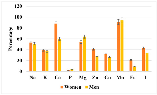 The percentage of men and women with inadequate mineral component intake relative to dietary reference values (EAR or AI). Data are presented as percentages with 95% confidence intervals (error bars) stratified by sex (women in orange, men in yellow). As shown, marked inadequacies were observed for calcium, magnesium, manganese, and iodine, particularly among women. The exact percentages with corresponding confidence intervals for both sexes are provided in Supplementary Table S4. Na, sodium; K, potassium; Ca, calcium; P, phosphorus; Mg, magnesium; Zn, zinc; Cu, copper; Mn, manganese; Fe, iron; I, iodine.