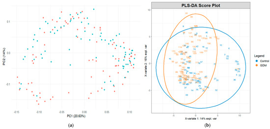 (a) Exploratory principal component analysis of metabolite profiles across study groups and (b) partial least squares discriminant analysis score plot demonstrating group separation based on metabolite profiles. The blue dots represent the control group and the orange dots represent the GDM group.