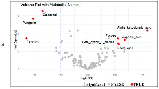 A volcano plot was generated to visualize the effect size (log2 odds ratio) and statistical significance (−log10 p-value) of metabolite associations with GDM, adjusted for maternal age, gestational duration, and BMI. Galactinol, pyrogallol, and arabitol were located on the left side of the plot, indicating lower levels in GDM cases (log2[OR] < 0), while maintaining strong statistical significance (Figure 2a). Conversely, metabolites such as Alpha-ketoglutaric acid, aspartic acid, Fucose, and isoleucine were positioned on the right side, indicating a positive association with GDM (log2[OR] > 0). This visual representation underscores a distinct pattern of metabolic dysregulation, with both up- and down-regulated metabolites contributing to the metabolic signature of GDM in breast milk.