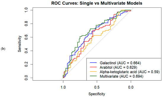 Univariate ROC analyses of individual metabolites with VIP > 2 showed moderate discriminative ability, with AUC values ranging from 0.566 to 0.664; galactinol achieved the highest AUC of 0.664 (Figure 2b, Table 3). Other significant metabolites with VIP scores > 2.0 included p-cresol, pyrogallol, citric acid, and glucopyranose, reflecting their high contribution to group separation in the multivariate model. Notably, several metabolites such as lauric acid, pyroglutamic acid, and isoleucine also demonstrated moderate discriminative ability (AUCs ranging from 0.54 to 0.60), despite their FDR-adjusted p-values being slightly above 0.05. The multivariate logistic regression model combining the top five metabolites improved classification performance, yielding an AUC of 0.683, and top three yielding an AUC of 0.694 (Figure 2b).