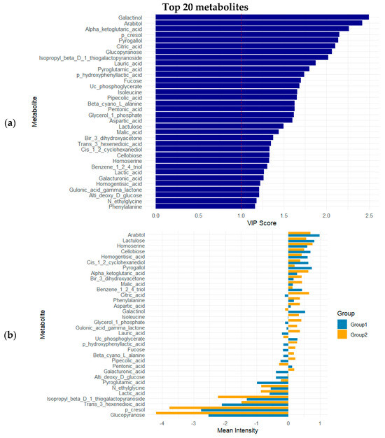 The top 20 variable importance in projection (VIP) metabolites were identified based on their contribution to group separation in the multivariate analysis (Figure 3a). Notably, metabolites such as glucopyranose, trans-3-hexenoic acid, isopropyl beta-D-1-thiogalactopyranoside, and p-cresol showed markedly higher mean intensities in Group 2 compared to Group 1 (Figure 3b). Conversely, compounds like arabinitol, lactulose, homoserine, and homogentisic acid demonstrated relatively higher intensities in Group 1.