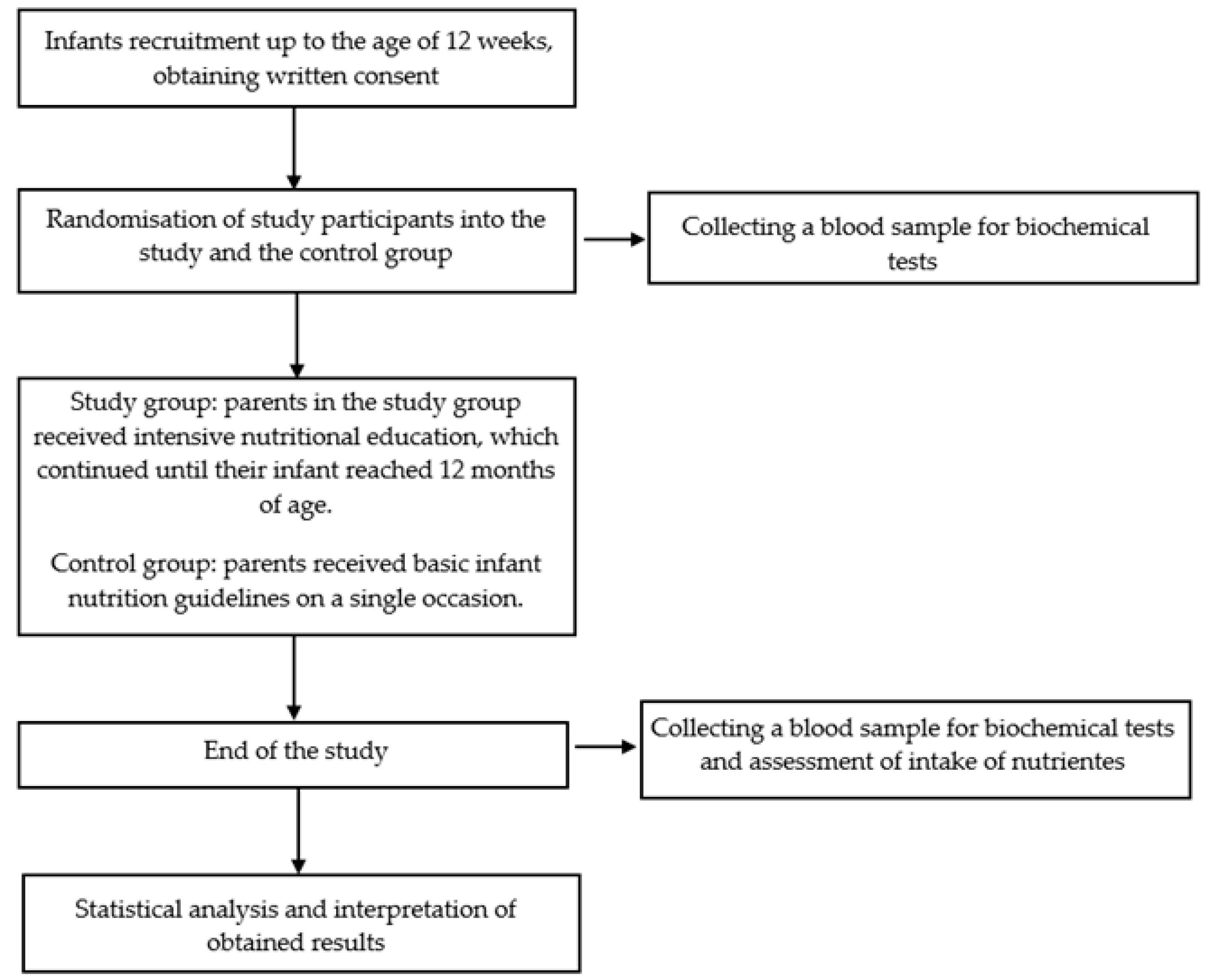 This study was designed as a randomized controlled study [27]. The study design is presented in Figure 1. Randomization was conducted by an unblinded study assistant who was not involved in the research process. The randomization table was generated using the website randomizer.org, with an allocation ratio of 1:1. Based on the simple independent randomization scheme. The process involved the study assistant inputting the list of eligible participants into the randomizer, which then produced a sequence of assignments randomly allocating each participant to either Group A or Group B. This sequence was used to ensure an unbiased and balanced distribution of participants across groups. After randomization, participants were assigned to one of the two groups based on this pre-determined sequence. Following group assignment (Group A or B), parents received a link to download a nutrition-focused mobile application along with an activation code. Depending on which group participants were assigned to, they received the appropriate access code for the application. The app had two versions—the study group received an access code to the full version of the app, which included information on the child’s diet expansion, sample menus, and an intensive nutrition education program delivered via short text messages sent to parents approximately 4–6 times per week focused on providing practical tips and recommending age-appropriate foods. These features aimed to ensure the child receives an adequate intake of iron in their diet. In contrast, the control group only received access to a general-purpose application containing basic infant nutrition guidelines, without specific dietary advice or sample menus, they also did not receive any notifications or tailored messages. Nutritional intervention lasted until 12 months of age.