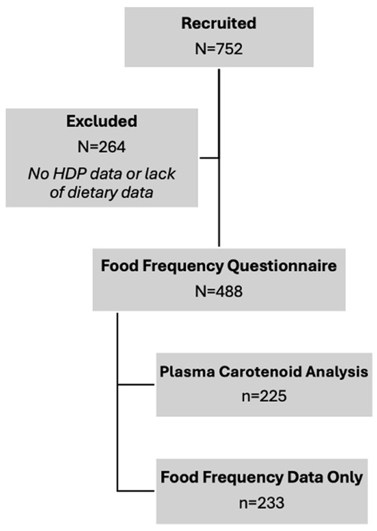 Subjects missing HDP or nutrient intake data were excluded from analyses, since these data are key to the central objective of this study. Descriptive statistics, including medians and inner quartiles for continuous variables and frequencies and percentages for categorical variables, were calculated. The normality of continuous variables was assessed by skewness and kurtosis tests. Statistical differences between continuous maternal demographics data were assessed using Kruskal–Wallis tests. Statistical differences between categorical maternal demographics variables were assessed using chi-squared tests. Statistical differences between raw dietary intake and blood levels of carotenoids were assessed using Kruskal–Wallis tests with Dunn’s post-hoc multiple comparisons tests. To account for potential confounding, dietary intake and blood carotenoid levels were log-transformed and examined in exploratory multinomial regression models adjusted for maternal pre-pregnancy BMI and parity. These models are considered exploratory given the limited sample size in blood carotenoid analyses, which may inflate standard errors and reduce the precision of estimates. Summary statistics of demographics data and exploratory multinomial regression analyses were performed using Stata 18.5. Statistical analyses and visualization of raw dietary intake and blood levels of carotenoids was performed using GraphPad Prism (version 10.6.0). The threshold of significance was set at p-value < 0.05.