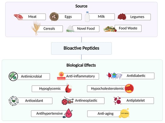 Chronic diseases, such as cancer, diabetes, and cardiovascular conditions, are particularly challenging to manage due to their multifactorial etiology. As a result, nature-based therapies have become a significant focus of research in recent years. Among these, natural bioactive compounds, such as polyphenols and bioactive peptides (BPs), have increasingly attracted scientific interest. Bioactive peptides are fragments of proteins with relevant beneficial functions on human health and have a length ranging from 2 to 20 amino acid residues [1,2,3]. These molecules are isolated from both animal and plant sources, such as meat, eggs, milk, pulses, and cereals, but can also be obtained by food waste or novel foods, i.e., insects (Figure 1) [4,5,6].