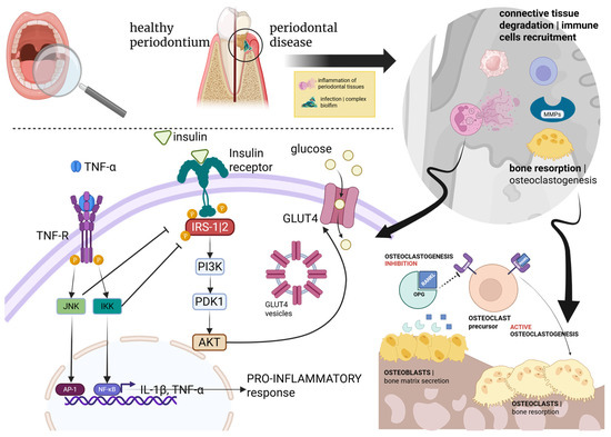 Periodontitis can be triggered by microorganism-derived dental biofilm and the consequent host’s immune response, involving recruitment of immune cells (e.g., neutrophils, lymphocytes, and macrophages), activation of lytic enzymes, such as matrix metalloproteinases (MMPs), and osteoclastogenesis via the RANK–RANKL–OPG axis (Figure 2) [30]. This signaling pathway plays a key role in bone metabolism, and it is regulated by the receptor activator of NF-κB (RANK), its ligand RANKL, and osteoprotegerin (OPG), a member of the TNF superfamily acting as a competitive inhibitor of RANKL and preventing its interaction with RANK [31]. Consequently, OPG activity leads to a reduction in RANK-mediated downstream effects, such as bone remodeling and osteoclast activation [30,31]. Periodontal disease can be further exacerbated in the presence of chronic comorbidities, such as diabetes. Indeed, the RANK–RANKL–OPG axis is subject to modulation by various hormones and cytokines, particularly TNF-α, which contributes to insulin resistance and a pro-inflammatory state [30,31]. Specifically, TNF-α binds to its receptor (TNF-R), activating two kinases, JNK and IKK, which in turn activate the transcription factors AP-1 and NF-κB (through degradation of its inhibitor, IκB), respectively [30,32]. These transcription factors translocate to the cell nucleus and induce the expression of pro-inflammatory cytokines, such as interleukin-1 beta (IL-1β) and TNF-α, creating a positive feedback loop sustaining inflammation. Moreover, insulin binds to the insulin receptor and activates IRS-1/2 (Insulin Receptor Substrates 1 and 2). It should be noted that, in addition to their chronic nature, a shared genetic architecture between periodontal disease and T2DM was demonstrated by many single nucleotide polymorphisms (SNPs), predisposing T2DM-affected people to periodontitis [33,34,35]. This connection was further supported by a comprehensive genome-wide analysis involving thousands of European individuals, demonstrating a genetic link between diseases and glycemic traits, influenced by biological pleiotropy. Pleiotropy, in this context, refers to the existence of common pathogenic pathways across different diseases, driven by shared genetic variants [36,37].