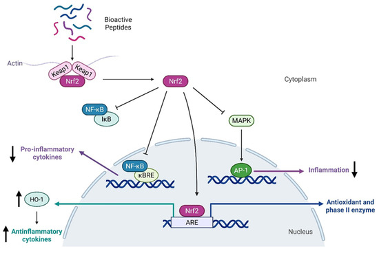 These bioactive peptides exhibit anti-inflammatory effects by targeting critical pathways such as NF-κB (Nuclear Factor kappa-light-chain-enhancer of activated B cells) and MAPK (Mitogen-Activated Protein Kinase), both of which play fundamental roles in sustaining chronic inflammation [54,55,58]. For example, a peptide derived from casein, containing the sequence Gln-Glu-Pro-Val, has been found to inhibit nitric oxide production, while increasing the secretion of anti-inflammatory cytokines IL-4 and IL-10 [59]. Moreover, some peptides derived from milk products have shown particular benefits in managing inflammation status due to their antioxidative and anti-inflammatory properties, as confirmed by multiple studies [60,61]. This aspect was demonstrated to be correlated with the activation of the pathway regulating redox homeostasis, which is modulated by Kelch-like ECH-associated protein 1 (Keap1) and the Nuclear factor erythroid 2-related factor 2 (Nrf2), and the action of the latter on Nrf2/ARE/HO-1 axis, which is involved in the inhibition of NF-κB pathway [62]. The molecular mechanisms activated by bioactive peptides are reported in Figure 3.