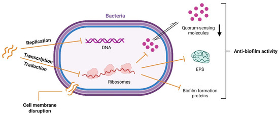 Some antimicrobial peptides (AMPs) induce cell lysis through electrostatic interactions with the microbial membrane, disrupting membrane permeability and inhibiting protein, RNA, and DNA synthesis. Moreover, some AMPs can penetrate the cell and interfere directly with replication and transcription by targeting DNA or RNA (Figure 4) [77,78].