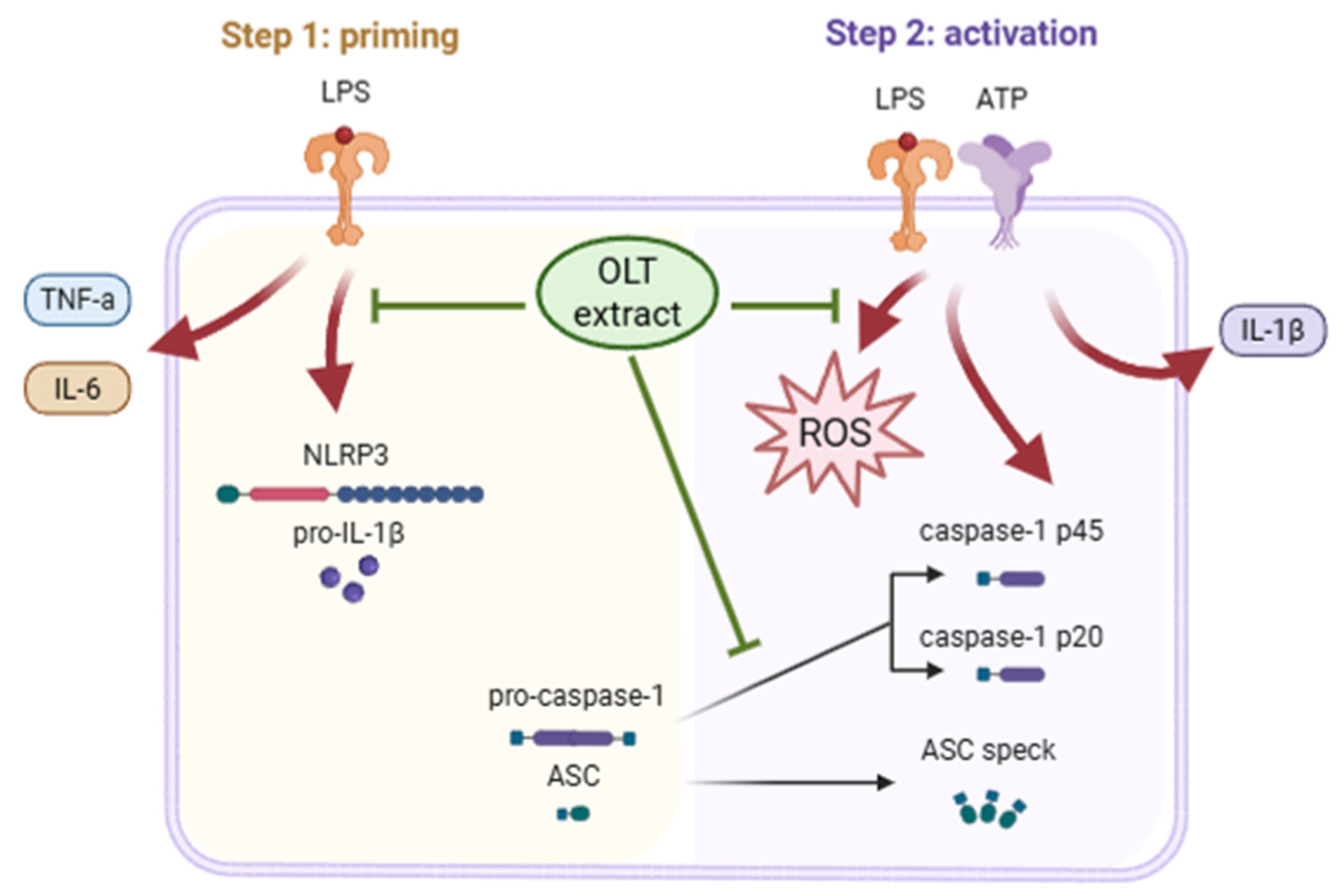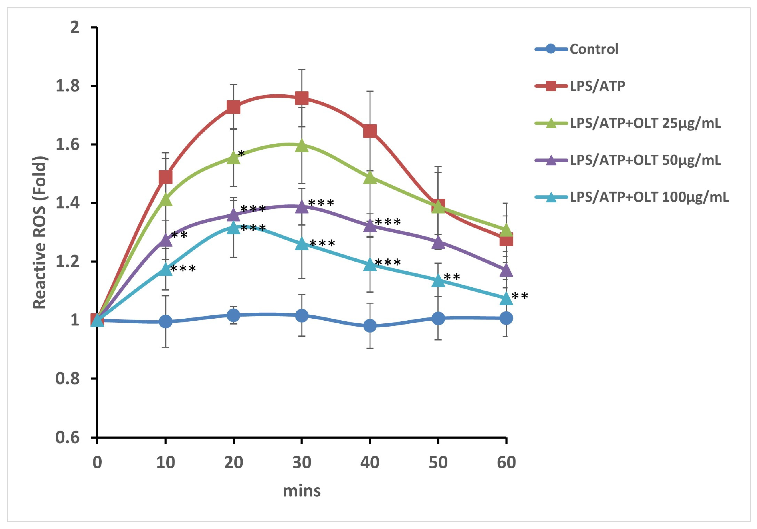 3.4. OLT Extracts Attenuate LPS/ATP-Induced ROS Generation in a Time- and Dose-Dependent Manner