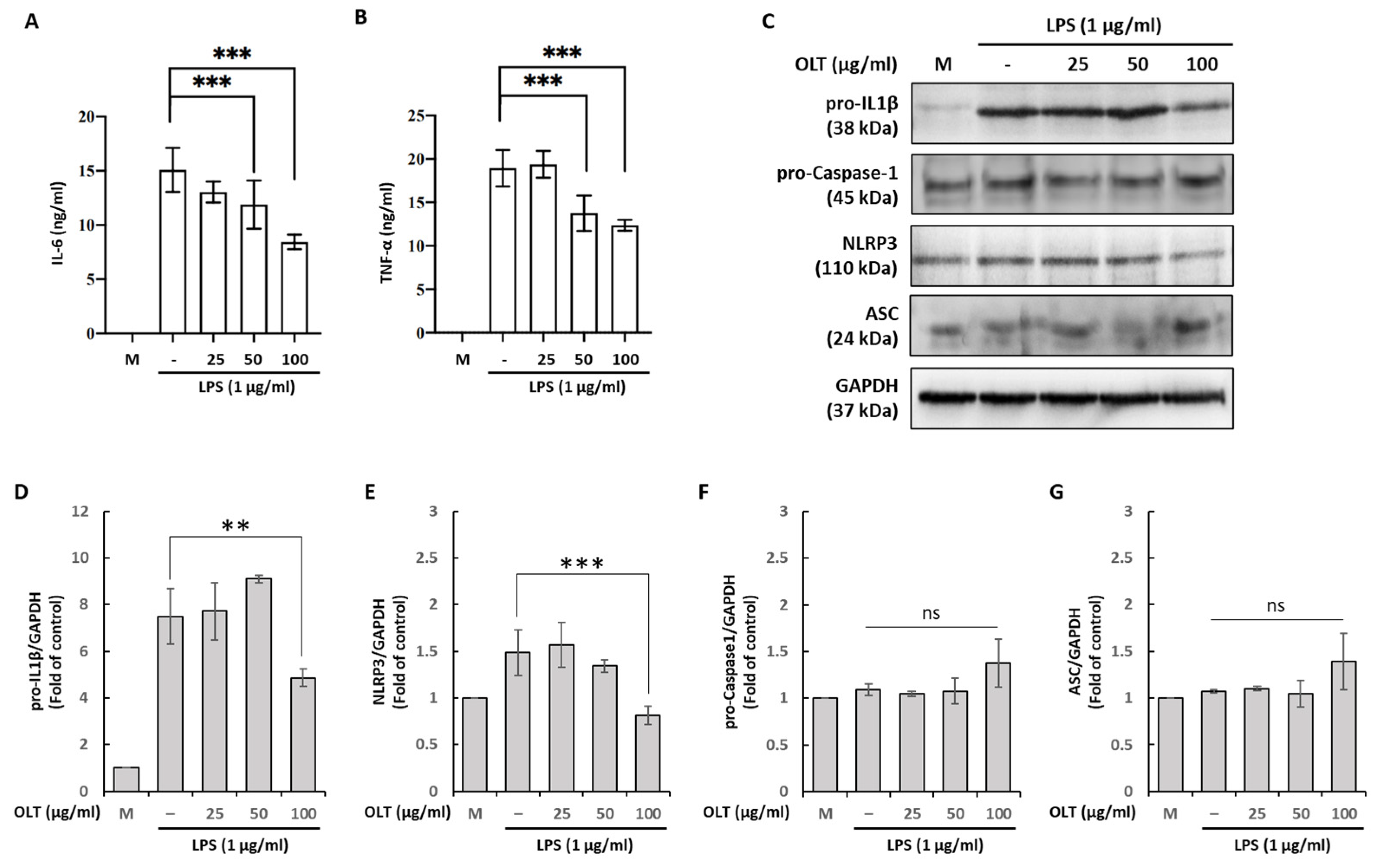 3.2. OLT Reduces LPS Priming Outputs (IL-6/TNF-α, pro-IL-1β, NLRP3) While ASC and Pro-Caspase-1 Remain Unchanged