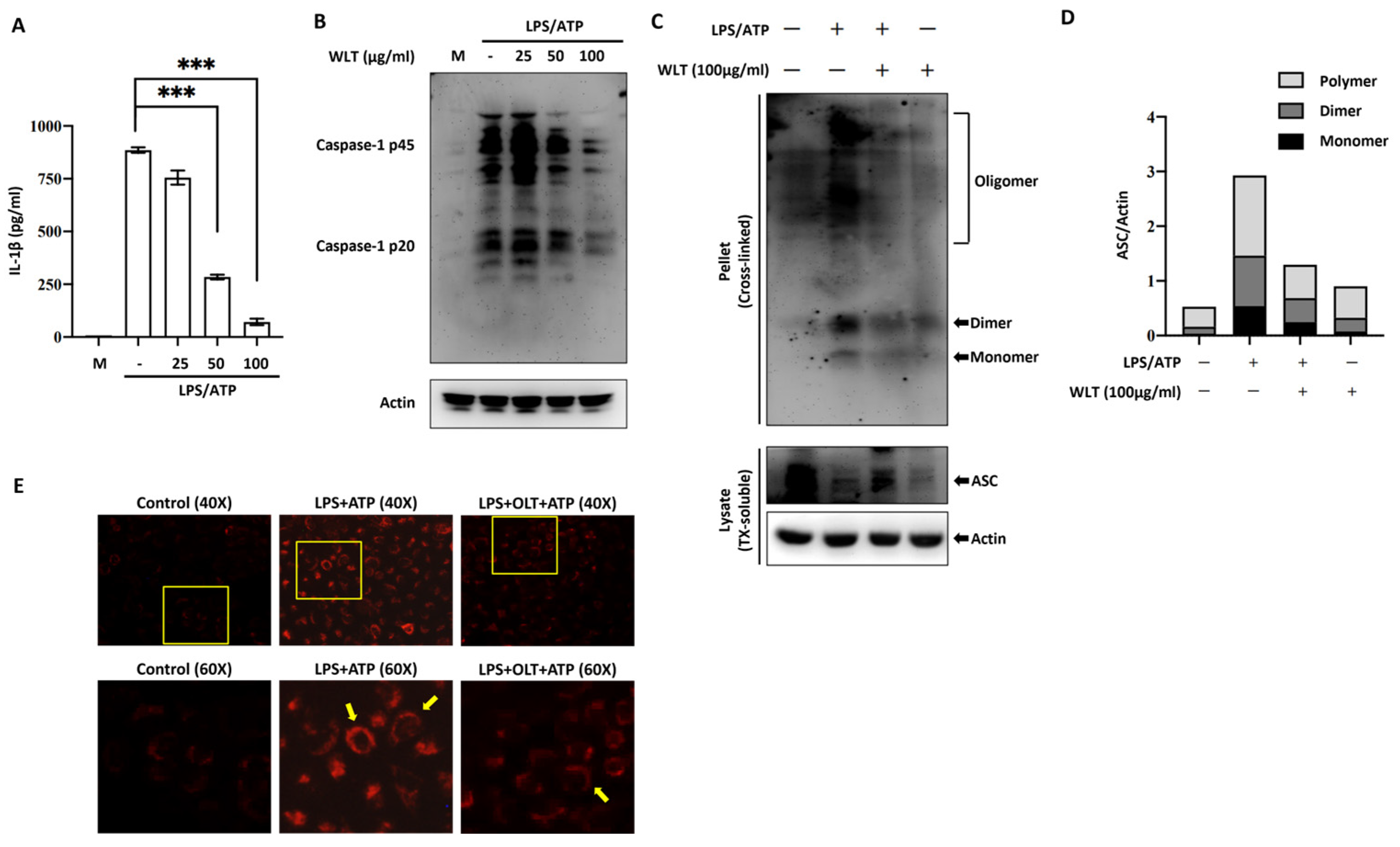 3.3. OLT Inhibits NLRP3 Inflammasome Activation by Suppressing IL-1β Secretion, Caspase-1 Activation, and ASC Oligomerization