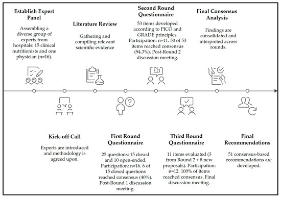 The Delphi process consisted of three iterative rounds (Figure 1). Round 1 included a mixed questionnaire of 25 items: 15 multiple-choice closed questions with predefined answers and 10 open-ended questions aimed at describing institutional practices in nutritional screening, clinical assessment, dietary intervention, and monitoring. The closed questions were designed by the methodological team, which comprised three researchers with expertise in clinical nutrition and evidence synthesis and were validated through independent expert review. A pilot test was conducted with a subgroup of three panelists to ensure clarity, feasibility, and completion time, leading to minor adjustments before launch.