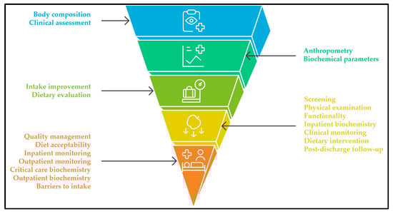 The consolidated framework emphasizes the systematic implementation of nutritional screening at hospital admission, followed by an integrated clinical assessment that incorporates objective measures, medical history, and drug–nutrient interactions. Physical examination and anthropometric assessment are standardized as core practices, complemented by body composition analysis—notably bioelectrical impedance and phase angle—as prognostic markers. Functional evaluation, primarily through handgrip strength, is recognized as an essential component of comprehensive nutritional status assessment.