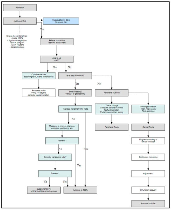 Algorithm for nutritional support decision-making in hospitalized patients according to nutritional risk assessment. Clinical decision flowchart used to guide the type of nutritional support in hospitalized patients based on the initial nutritional risk evaluation. The algorithm considers oral feeding capacity, gastrointestinal functionality, and tolerance to enteral nutrition to determine the most appropriate route, including parenteral nutrition options when necessary.