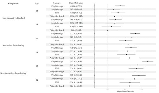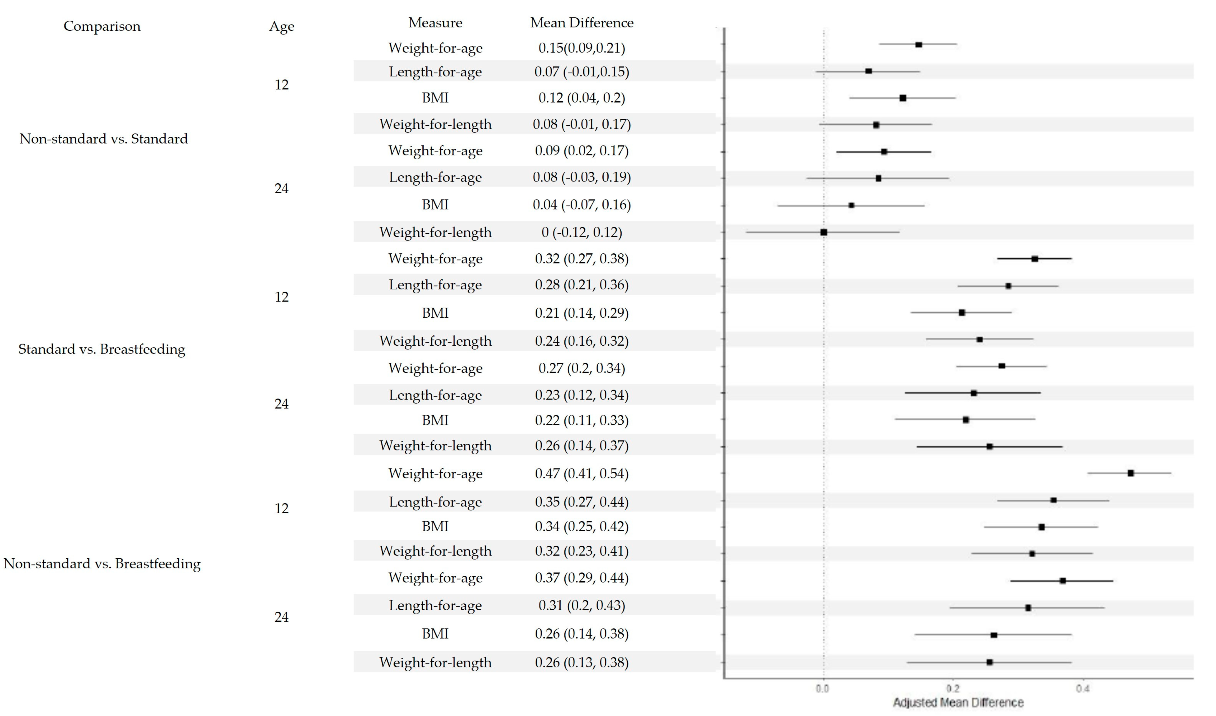 | 24 | Standard Formula | Breastfeeding | 0.195 | 0.073 | 0.317 | 0.0018 | |