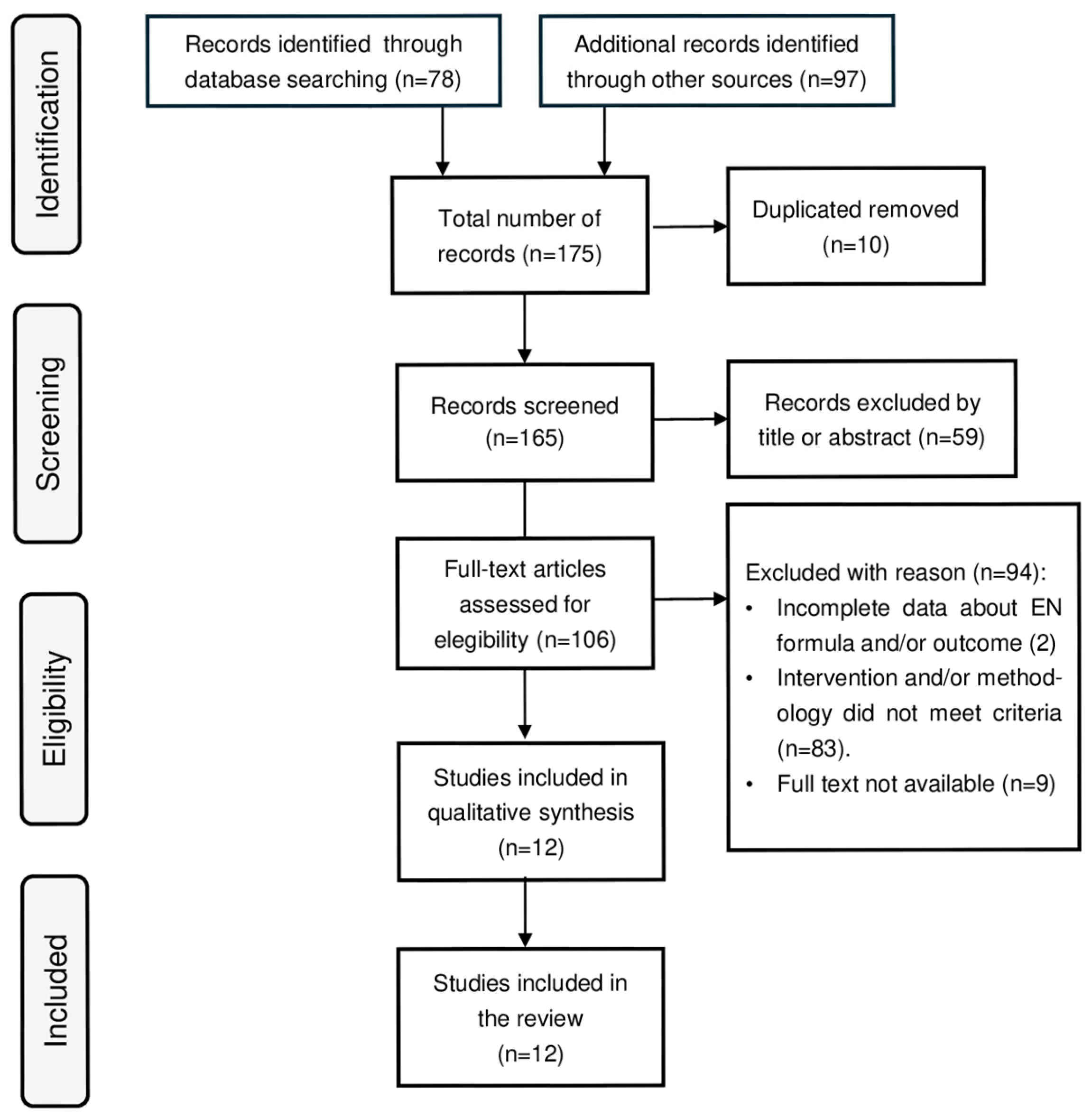 Terrin et al. [49] | EN (EN group) vs. corticosteroids (steroid group) | Total: 20 patients EN group: 10 patients Steroid group: 10 patients | Pediatric | N/A | Both treatments were effective in significantly reducing PCDAI, but only EN showed significantly lower post-intervention scores (p < 0.01 vs. p = NS) | Significantly increased only in the EN group (p < 0.01 vs. p = NS) | CRP decreased significantly in both groups, especially in the EN group (p < 0.01 vs. p < 0.05). ESR decreased significantly in both groups (p < 0.01 in both) |