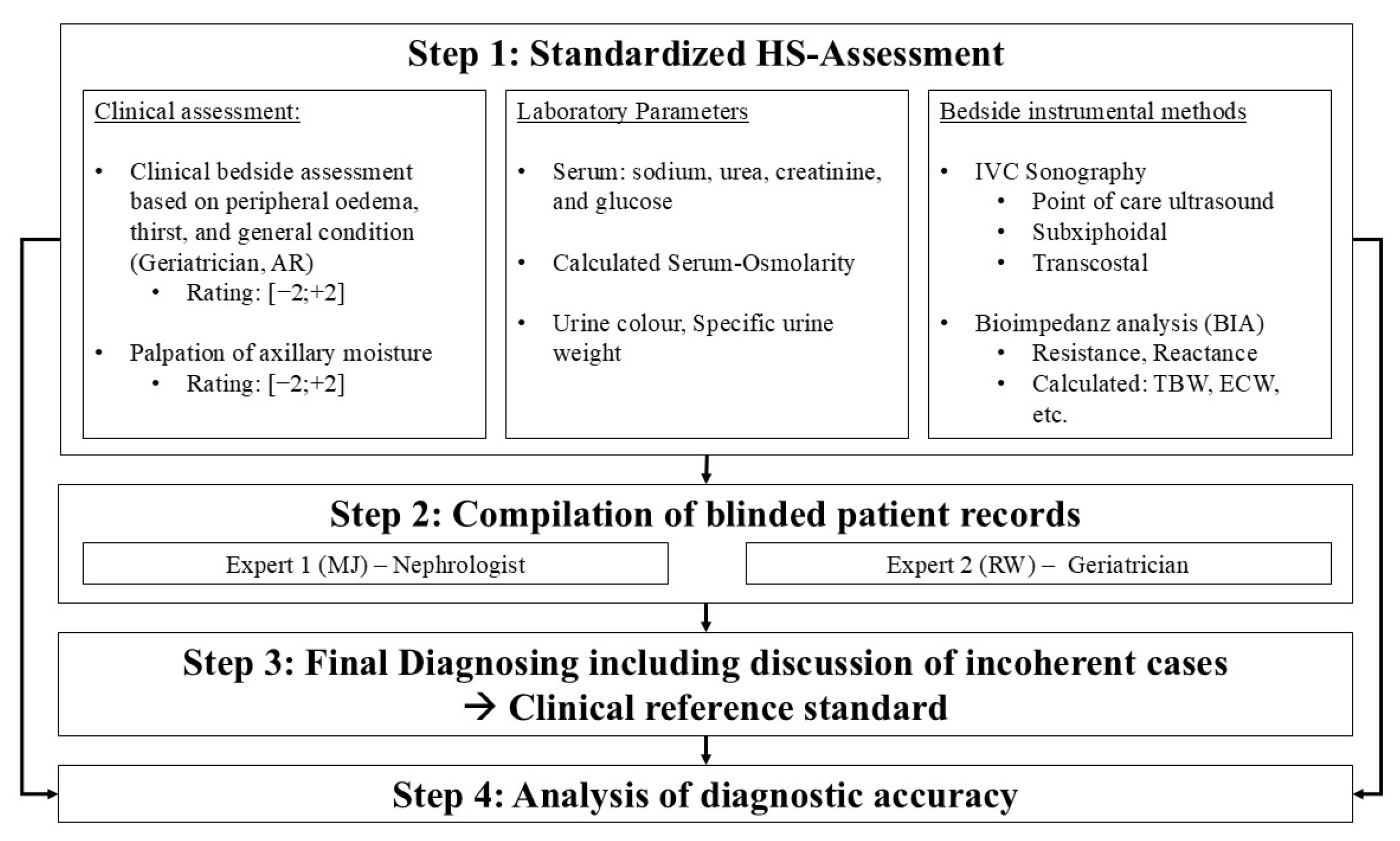To date, there is no universally accepted gold standard for assessing HS in geriatric patients [13,16]. In present literature, reproducibility and comparability are impaired by the utilisation of diverse and at times poorly described reference standards [7]. Furthermore, the assessment of a global HS has not been proposed before. Utilising standard references for only low-intake dehydration or hypovolemia for this approach is not a rational course of action. The STARD guidelines for reporting diagnostic accuracy define a clinical reference standard as the best available method to determine the presence of the target condition [17]. In evaluating the overall HS in geriatric patients, no single test by itself appears to be sufficient to discriminate between all possible conditions [7]. Therefore, the most reliable diagnostic approach appears to be an informed clinical assessment that integrates all relevant information. Recognizing this lack of a diagnostic gold standard, the following study protocol was designed. Figure 1 additionally displays our diagnostic procedure.