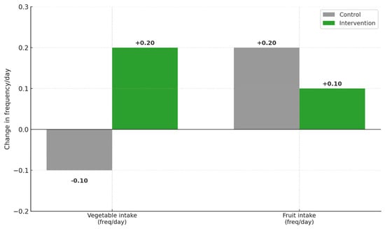 For weight, there was a significant time × group interaction. The control group’s weight increased from 41.81 ± 3.12 kg to 42.67 ± 3.06 kg (p-value ≤ 0.001; Δ = +0.86 kg), while the intervention group’s weight decreased from 42.45 ± 2.11 kg to 40.57 ± 2.14 kg (p-value ≤ 0.001; Δ = −1.88 kg). In terms of BMI (kg/m2), the control group exhibited a slight increase from 23.47 ± 2.07 to 23.50 ± 1.99 (p-value ≤ 0.001; Δ = +0.03), whereas the intervention group had a meaningful reduction from 25.02 ± 1.46 to 23.45 ± 1.45 (p-value ≤ 0.001; Δ = −1.57). The group effect was statistically significant (p-value = 0.001). The BMI z-score followed a similar trend. The control group increased from −0.45 ± 1.08 to 0.02 ± 1.17 (p-value = 0.050; Δ = +0.47), while the intervention group decreased from 0.36 ± 0.76 to −0.01 ± 0.85 (p-value ≤ 0.001; Δ = −0.37). Finally, for BMI percentile, the control group showed a small and non-significant increase from 96.29 ± 6.16 to 96.51 ± 4.71 (p-value = 0.072; Δ = +0.22), while the intervention group showed a significant decrease from 97.89 ± 1.16 to 97.10 ± 2.16 (p-value = 0.002; Δ = −0.79). A significant group effect (p-value = 0.031) and significant interaction (p-value = 0.002) were also observed for BMI percentile. Frequency/day of vegetable and fruit consumption was assessed pre- and post-intervention to indicate the effects of the school gardening program. In the intervention group, there was an remarkable upswing in vegetable consumption (2.7 ± 1.6 to 2.9 ± 1.5) to 3.1 1.6 times/day, with an absolute change of +0.2; p-value = 0.49, whereas in the control group, there was a considerable decline in vegetable consumption (2.5 ± 1.4 to 2.4 ± 1.5 times/day), with an absolute change of −0.1; p-value 0.886. There was a strong interaction in terms of time × group; p-value = 0.003. The gardening program, therefore, helped boost the consumption of vegetables, as shown in Table 2. However, fruit intake showed minimal non-significant changes in both groups; hence, fruit consumption was not affected. These findings suggest that the school gardening program was more effective in promoting vegetable consumption than fruit consumption among primary school. Regarding the daily consumed servings of fruit and vegetables after this intervention, Figure 1 illustrates that the intervention group showed a positive change of +0.20 servings/day for vegetable intake, while the control group decreased by −0.10 servings/day. For fruit intake, both groups showed modest positive changes (+0.10 servings/day for the intervention group and +0.20 servings/day for the control group), though these changes were not statistically significant. The contrasting patterns between groups demonstrate the intervention’s specific effectiveness in promoting vegetable consumption among primary school children.