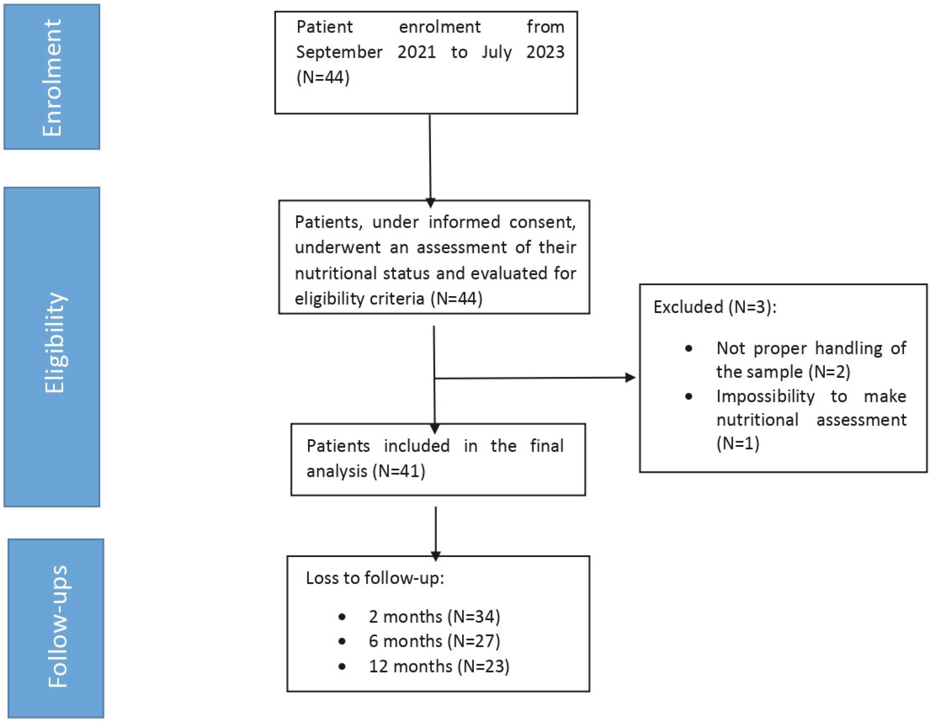 3.1. Collected Data Evaluation and Anthropometric/Nutritional Assessments of Enrolled Patients