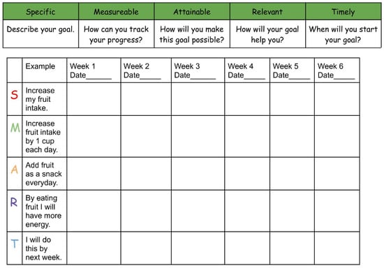 Participants set weekly SMART goals from Weeks 2 to 7 using a structured SMART goal setting worksheet (Figure 1) to support healthy behavior change [,]. Lesson worksheets were completed during each HI-FLY class or as homework to reinforce content understanding. Worksheet completion contributed to participant’s pass/fail HI-FLY grade.