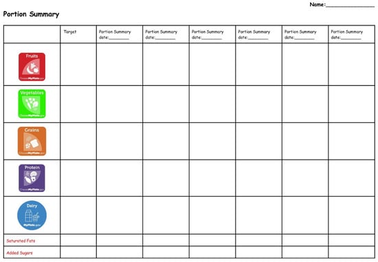 From Weeks 2–7, the HI-FLY + PSEd participants were instructed to bring their phones to school each week to support goal setting, and phones were secured by the school office when not in use. The app’s Portion Summary Screen, which displayed detailed food intake information, was used to guide the goal-setting process. This data was transferred onto hard copy Portion Summary Worksheets (Figure 2), allowing students to visualize food group intake patterns and inform behavior change.