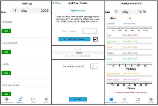 PSEd was installed onto each HI-FLY + PSEd participant’s study iPhone SE (3rd generation) and provided for the 7-week study. This was to ensure all participants had access to the app, and to control for type of smartphone used, as PSEd was only programmed for iOS at the time of this study. User details (age, sex, height, weight) were input into the app to produce EER and to generate personalized MyPlate food group goals [,]. A child-adapted version of the app was used in this pilot study, in which energy (kcal) information was removed from the Portion Summary Screen to ensure a focus on only diet quality (Figure 3). Additionally, the six culturally tailored HI-FLY nutritional education videos were embedded in the app [].