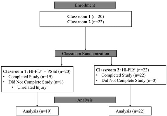 Of the 50 participants across the two classrooms, 42 (84%) provided consent to participate. There was one dropout (2.4%) from the study due to an unrelated injury, and they were excluded from all analyses (Figure 5). HI-FLY lesson attendance was high and similar between study groups (p = 0.95); with mean attendance across the six lessons being 95.6% (HI-FLY + PSEd) and 95.5% (HI-FLY). All participants passed the HI-FLY course which included completing all assigned HI-FLY worksheets.