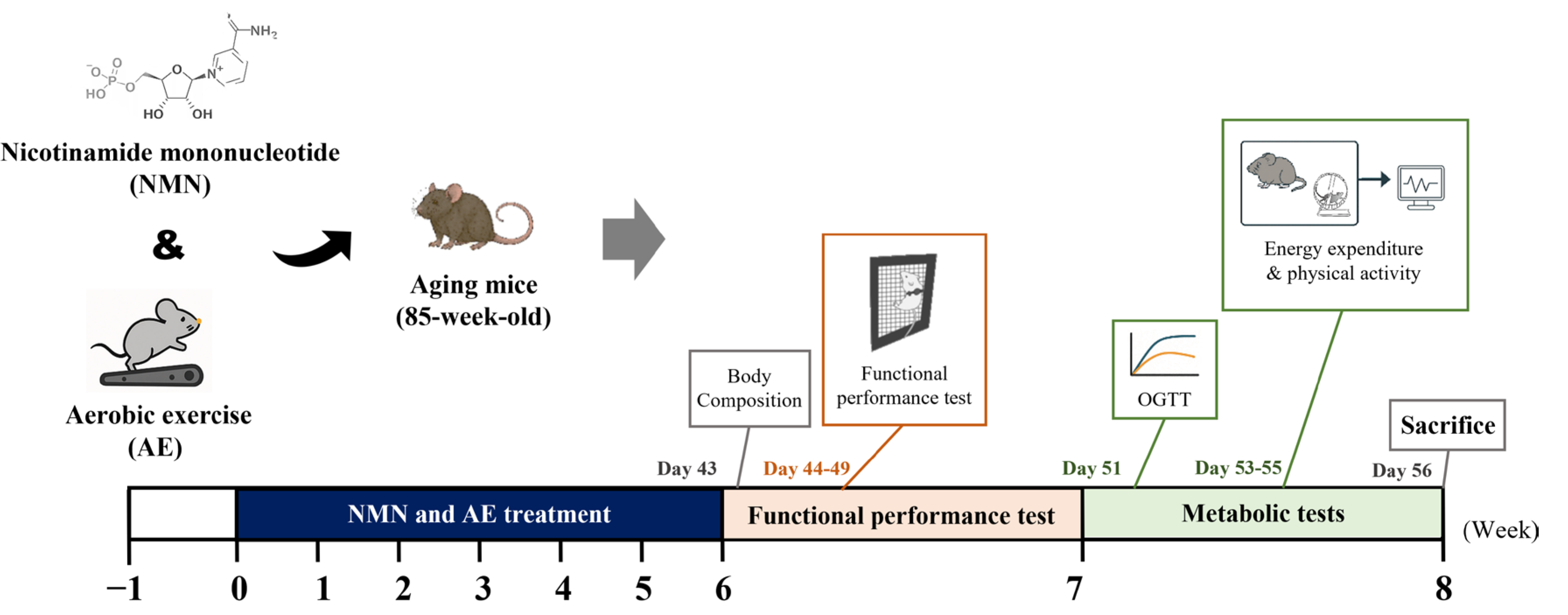 Therefore, this study aimed to evaluate whether the combination of NMN supplementation and endurance exercise could provide additive or synergistic benefits in mitigating age-related dysfunction. This study focused on evaluating aging-related changes in energy metabolism, body composition, and physical performance in naturally aged mice, with particular attention given to adaptations in mitochondrial function and glucose regulation that are commonly impaired during aging. We further examined whether this combined intervention could enhance the NAD+ salvage pathway and contribute to the maintenance of metabolic homeostasis, with the goal of mitigating age-related functional deterioration more effectively than NMN or exercise alone.